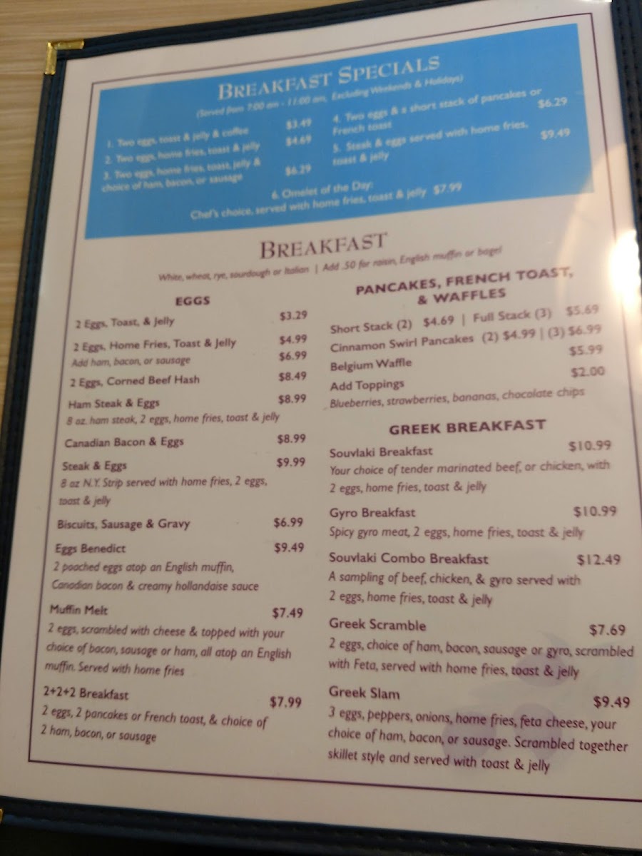 Start your morning with hearty options like the Greek omelette with Kalamata olives or a warm plate of Eggs Benedict with a chicken souvlaki twist. For midday or evening meals, the menu features satisfying favorites such as the fish fry, savory lamb chops, or the classic Greek salad accompanied by fresh tzatziki. Light bites and salads provide a pleasant balance for those seeking something less heavy, while the sampler platters bring a variety of traditional tastes together in one experience.